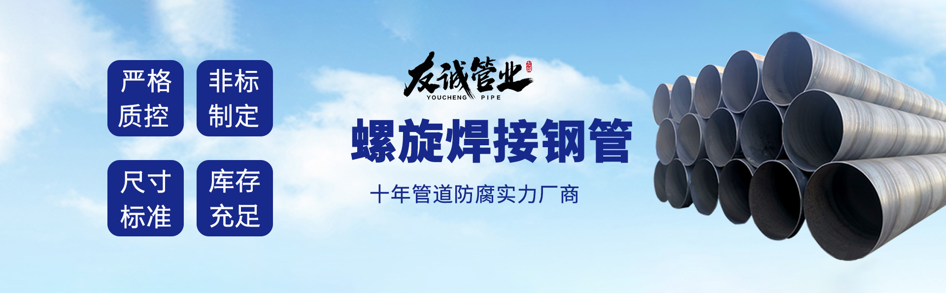 滄州友誠(chéng)管業(yè)有限公司是一家專業(yè)從事生產(chǎn)防腐涂塑管道及管件于一體的大型企業(yè)。公司注冊(cè)資金8600萬(wàn)元,位于中國(guó)管道生產(chǎn)基地—河北鹽山縣,近靠京滬高速、榮烏高速、黃石高速30公里,高鐵滄州西站40公里,天津國(guó)際機(jī)場(chǎng)、濟(jì)南遙墻機(jī)場(chǎng)150公里,為客戶來訪及業(yè)務(wù)發(fā)展提供了便利的交通條件。        鋼管系列:螺旋鋼管、無縫鋼管、ERW直縫焊管、JCOE埋弧焊直縫鋼管、熱鍍鋅鋼管。        涂塑系列:內(nèi)外涂塑鋼管、涂塑復(fù)合鋼…… 了解更多